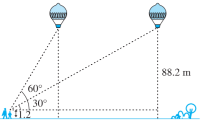 $1.2 m$ लंबी एक लड़की भूमि से $88.2 m$ की ऊँचाई पर एक क्षैतिज रेखा में हवा में उड़ रहे गुब्बारे को देखती है। किसी भी क्षण लड़की की आँख से गुब्बारे का उन्नयन कोण $60^\circ$ है। कुछ समय बाद उन्नयन कोण घटकर $30^\circ$ हो जाता है $($देखिए आकृति$)।$ इस अंतराल के दौरान गुब्बारे द्वारा तय की गई दूरी ज्ञात कीजिए।