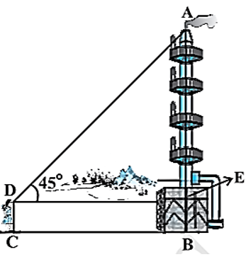 यहाँ $AB$ चिमनी है, $CD$ प्रेक्षक है और $\angle \text{ADE}$ उन्नयन कोण है $($देखिए आकृति$)$। यहाँ $\text{ADE}$ एक त्रिभुज है जिसमें कोण $E$ समकोण है और हमें चिमनी की ऊँचाई ज्ञात करनी है।