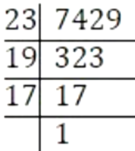 7429 का अभाज्य गुणनखंड = 17 $\times$ 19 $\times$ 23