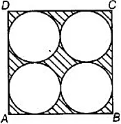 $784 \ cm^2$ क्षेत्रफल वाले एक वर्गाकार गत्ते की शीट पर, अधिकतम माप की चार सर्वांगसम वृत्ताकार प्लेटें इस प्रकार रखी गयी हैं कि प्रत्येक वृत्ताकार प्लेट अन्य दो प्लेटों को स्पर्श करती है तथा वर्गाकार शीट की प्रत्येक भुजा दो वृत्ताकार प्लेटों को स्पर्श करती है। वर्गाकार शीट के उस भाग का क्षेत्रफल ज्ञात कीजिए जो वृत्ताकार प्लेटों द्वारा ढका नहीं गया है।