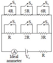 Say switches $S_1, S_2$ and so on upto $S_6$ are closed, one after other in order (first $S_1$, then $S_2$) at regular intervals of $1$ minute starting from $t = 0$. The graph of current versus time is best represented as