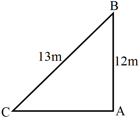 By Pythagoaras theoram, we have $\text{CB}^2=\text{AB}^2+\text{AC}^2$ $\text{AC}^2=\big[\text{CB}^2-\text{AB}^2\big]$ $=\Big[(13)^2-(12)^2\Big]\text{m}^2$ $=(169-144)\text{m}^2$ $=25\text{m}^2$ $\Rightarrow\text{AC}=\sqrt{25}\text{m}=5\text{m}$ Hence, the distance of the fool of the ladder from the building is 5m.