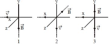 The figure shows three situations when an electron moves with velocity $\vec v$ travels through a uniform magnetic field $\vec B$. In each case, what is the direction of magnetic force on the electron