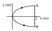A conducting wire bent in the form of a parabola $y^2 = 2x$ carries a current $i = 2 A$ as shown in figure. This wire is placed in a uniform magnetic field $\vec B = - 4\,\hat k$ $Tesla$. The magnetic force on the wire is (in newton)