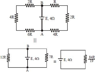 A battery of internal resistance $4\,\Omega $ is connected to the network of the resistance as shown in Fig. If the maximum power can be delivered to the network, the magnitude of $R$ in $\Omega $ should be