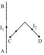 In the figure shown a current $I_1$ is established in the long straight wire $AB$.Another wire $CD$ carrying current $I_2$ is placed in the plane of the paper. The line joining the ends of this wire is perpendicular to the wire $AB$. The force on the wire $CD$ is: