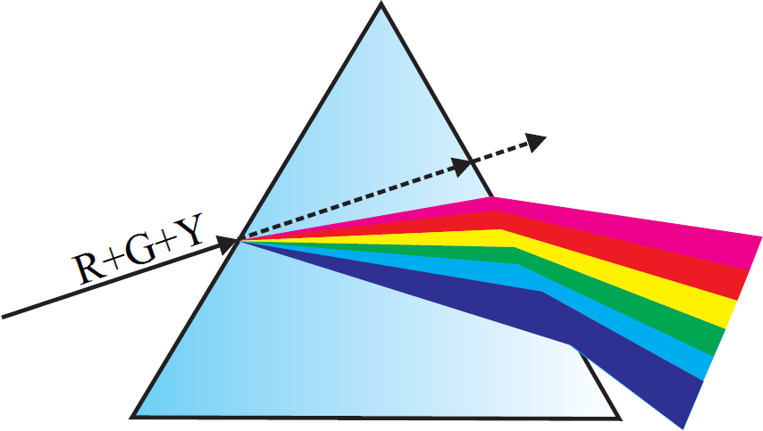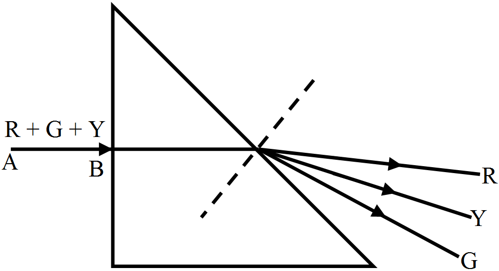 A beam of light consisting of consists of three. namely red (R), Green (G) and yellow (Y) on the prism as shown below. Complete the diagram to show refracted and emergent ray.