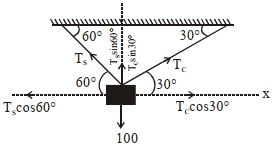 $T _{ C } \sin 30^{\circ}+ T _{ S } \sin 60^{\circ}=100$