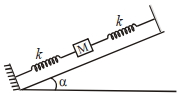In the given figure, a body of mass $M$ is held between two massless springs, on a smooth inclined plane. The free ends of the springs are attached to firm supports. If each spring has spring constant $k,$ the frequency of oscillation of given body is :