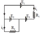 The current $i_1$ and $i_2$ through the resistor $R_1 (= 10\,\Omega )$ and $R_2 (=30 \,\Omega )$ in the circuit diagram with $E_1 = 3\,V, E_2 = 3\,V$ and $E_3 = 2\,V$ are respectively: