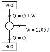A Carnot engine operates between two reservoirs of temperatures $900\; \mathrm{K}$ and $300 \;\mathrm{K}$ The engine performs $1200\; \mathrm{J}$ of work per cycle. The heat energy (in $\mathrm{J}$ ) delivered by the engine to the low temperature reservoir, in a cycle. is