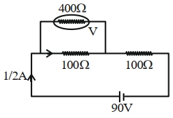 A cell of emf $90\,V$ is connected across series combination of two resistors each of $100\,\Omega$ resistance. A voltmeter of resistance $400\,\Omega$ is used to measure the potential difference across each resistor. The reading of the voltmeter will be $.........\,V$