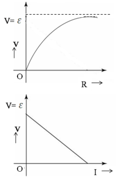 A cell of emf 'E' and internal resistance 'r' is connected across a variable load resistor R. Draw the plots of the terminal voltage V versus (i) R and (ii) the current I.