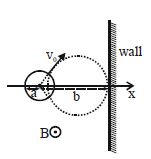 An electron is projected normally from the surface of a sphere with speed $v_0$ in a uniform magnetic field perpendicular to the plane of the paper such that its strikes symmetrically opposite on the sphere with respect to the $x-$ axis. Radius of the sphere is $'a'$ and the distance of its centre from the wall is $'b'$ . What should be magnetic field such that the charge particle just escapes the wall