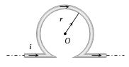An infinitely long straight conductor is bent into the shape as shown in the figure. It carries a current of $i$ $ampere$ and the radius of the circular loop is $r$ $metre$. Then the magnetic induction at its centre will be