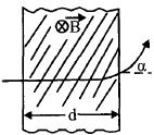 A proton (mass $m$ ) accelerated by a potential difference $V$ flies through a uniform transverse magnetic field $B.$ The field occupies a region of space by width $'d'$. If $\alpha $ be the angle of deviation of proton from initial direction of motion (see figure), the value of $sin\,\alpha $ will be