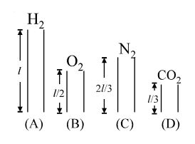 Four open organ pipes of different lengths and different gases at same temperature as shown in figure. Let $f_A$, $f_B$, $f_C$ and $f_D$ be their fundamental frequencies then :[Take ${\gamma _{c{o_2}}} = 7/5$]