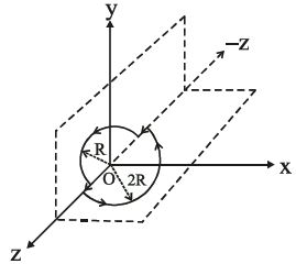 In given diagram, two current carrying circular loop of radius $R$ and $2R$ are arranged in $YZ-$ plane and $XZ-$ plane respectively. Common centre of both are at origin $O$. Then what will be angle of resultant magnetic field from $X-$ axis.