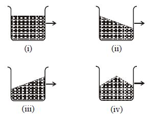 A vessel containing water is moving with a constant speed towards right along a straight horizontal path. Which of the following diagrams represents the surface of liquid?