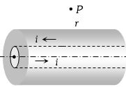 A current $i$ ampere flows along the inner conductor of a coaxial cable and returns along the outer conductor of the cable, then the magnetic induction at any point outside the conductor at a distance $r$ metre from the axis is