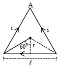 Current is flowing in clockwise direction so, $\overrightarrow{{B}}$ is inside plane of triangle by right hand rule.