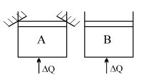 Two identical vessels $A \& B$ contain equal amount of ideal monoatomic gas. The piston of $A$ is fixed but that of $B$ is free. Same amount of heat is absorbed by$A \& B$. If $B'$s internal energy increases by $100 \,\,J$ the change in internal energy of $A$ is ...... .$J$