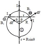 $=2 \mathrm{I}(\mathrm{R} \mathrm{d} \theta)\left(\frac{\mu_{0} \mathrm{I}}{2 \pi r}\right) \sin \theta$