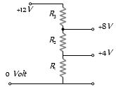 A potential divider is used to give outputs of $4\, V$ and $8\, V$ from a $12\, V$ source. Which combination of resistances, $(R_1, R_2, R_3)$ gives the correct voltages ? $R_1 : R_2 : R_3$