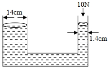 A hydraulic press containing water has two arms with diameters as mentioned in the figure. A force of $10 \mathrm{~N}$ is applied on the surface of water in the thinner arm. The force required to be applied on the surface of water in the thicker arm to maintain equilibrium of water is_________.${N}$.