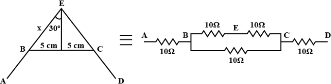 since all parts are of same length, thus resistance of each part $R=10 \times 1=10 \Omega$ Equivalent circuit is also shown above.