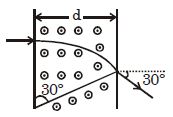 A particle of charge $q$, mass $m$ enters in a region of magnetic field $B$ with velocity $V_0 \widehat i$. Find the value of $d$ if the particle emerges from the region of magnetic field at an angle $30^o$ to its ititial velocity:-