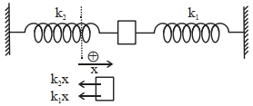 A mass $m$ is attached to two springs as shown in figure. The spring constants of two springs are $K _1$ and $K _2$. For the frictionless surface, the time period of oscillation of mass $m$ is