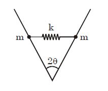 Two particles of mass $m$ are constrained to move along two horizontal frictionless rails that make an angle $2\theta $ with respect to each other. They are connected by a spring with spring constant $k$ . The angular frequency of small oscillations for the motion where the two masses always stay parallel to each other (that is the distance between the meeting point of the rails and each particle is equal) is