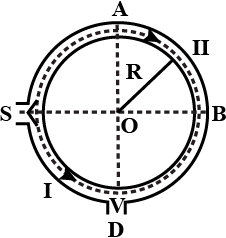 Let $\lambda$ be the wavelength of the waves. Now for minima to occur at $\mathrm{D}$, path difference $=\left(n+\frac{1}{2}\right) \lambda$ where $n=0,1,2, \ldots \ldots \ldots$ Thus $\frac{(2 n+1) \lambda}{2}=\pi R \Longrightarrow \lambda=\frac{2 \pi R}{2 n+1}$