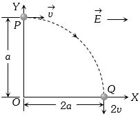 A particle of charge $+q$ and mass $m$ moving under the influence of a uniform electric field $E\hat i$ and a uniform magnetic field $B\hat k$ follows trajectory from $P$ to $Q$ as shown in figure. The velocities at $P$ and $Q$ are $v\hat i$ and $ - 2v\hat j$ respectively. Which of the following statement(s) is/are correct