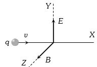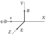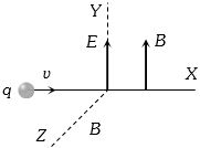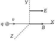 A particle of charge $q$ and mass $m$ is moving along the $x$ -axis with a velocity $v$ and enters a region of electric field $E$ and magnetic field $B$ as shown in figure below for which figure the net force on the charge may be zero