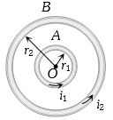 $A$ and $B$ are two concentric circular conductors of centre $O$ and carrying currents ${i_1}$ and ${i_2}$ as shown in the adjacent figure. If ratio of their radii is $1 : 2$ and ratio of the flux densities at $O$ due to $A$ and $B$ is $1 : 3$, then the value of ${i_1}/{i_2}$ is