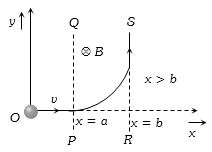 (b) In the figure, the $z$-axis points out of the paper, and the magnetic field is directed into the paper, existing in the region between $PQ$ and $RS$. The particle moves in a circular path of radius $r$ in the magnetic field. It can just enter the region $x > b$ for $r \ge (b - a)$