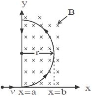 A particle of mass $m$ and charge $q$ moves with a constant velocity $v$ along the positive $x$ direction. It enters a region containing a uniform magnetic field $B$ directed along the negative $z$ direction, extending from $x = a$ to $x = b$. The minimum value of $v$ required so that the particle can just enter the region $x > b$ is