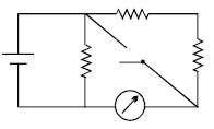 In the circuit shown, the reading of the Ammeter is doubled after the switch is closed. Each resistor has a resistance $1\,\Omega $ and the ideal cell has an $e.m.f.$ $10\, V$. Then, the Ammeter has a coil resistance equal to ............... $\Omega$