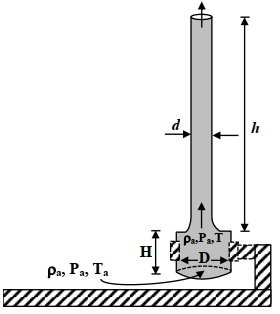 A cylindrical furnace has height $(H)$ and diameter $(D)$ both $1 \mathrm{~m}$. It is maintained at temperature $360 \mathrm{~K}$. The air gets heated inside the furnace at constant pressure $P_a$ and its temperature becomes $T=360 \mathrm{~K}$. The hot air with density $\rho$ rises up a vertical chimney of diameter $d=0.1 \mathrm{~m}$ and height $h=9 \mathrm{~m}$ above the furnace and exits the chimney (see the figure). As a result, atmospheric air of density $\rho_a=1.2 \mathrm{~kg} \mathrm{~m}^{-3}$, pressure $P_a$ and temperature $T_a=300 \mathrm{~K}$ enters the furnace. Assume air as an ideal gas, neglect the variations in $\rho$ and $T$ inside the chimney and the furnace. Also ignore the viscous effects.