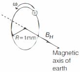 Net magnetic field at centre of loop is zero, when magnetic field due to rotating charge is exactly equal to the horizontal component of earth's magnetic ficld.