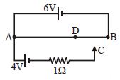 A $6\, volt$ battery of negligible internal resistance resistance is connected across a uniform wire $AB$ of length $100\,cm$. The positive terminal of another battery of $emf$ $4\,V$ and internal resistance $1\,\Omega $ is joined to the point $A$ as shown in fig. Take the potential at $B$ to be zero. At which point $D$ of the wire $AB$, from left the potential is equal to the potential at $C$ ? ...................... $cm$ (approximately)