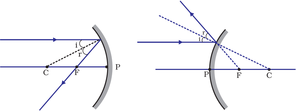 A ray of light is incident on a convex mirror as shown. Redraw the diagram and complete the path of this ray after reflection from the mirror. Mark angle of incidence and angle of reflection on it.