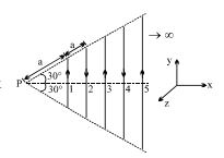 Infinite number of straight wires each carrying current $I$ are equally placed as shown in the figure. Adjacent wires have current in opposite direction. Net magnetic field at point $P$ is