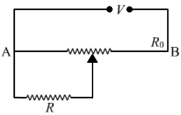 A resistance of $R$ draws current from a potentiometer. The potentiometer wire, $AB,$ has a total resistance of $R_o$. A voltage $V$ is supplied to the potentiometer. Derive an expression for the voltage across $R$ when the sliding contact is in the middle of potentiometer wire.