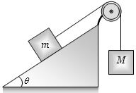 A wire of $9.8 \times {10^{ - 3}}kg{m^{ - 1}}$ passes over a frictionless light pulley fixed on the top of a frictionless inclined plane which makes an angle of $30°$ with the horizontal. Masses $m$ and $M$ are tied at the two ends of wire such that $m$ rests on the plane and $M$ hangs freely vertically downwards. The entire system is in equilibrium and a transverse wave propagates along the wire with a velocity of $100 ms^{-1}$. Chose the correct option $m =$ ..... $kg$