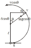 $\Rightarrow \frac{1}{2} m u^2=\frac{1}{2} m v^2+m g \ell(1+\cos \theta) \ldots \text { (i) }$