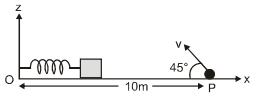 Simultaneously at $t=0$, a small pebble is projected with speed $v$ from point $P$ at an angle of $45^{\circ}$ as shown in the figure. Point $P$ is at a horizontal distance of $10 \ cm$ from $O$. If the pebble hits the block at $t=1 \ s$, the value of $v$ is (take $g =10 \ m / s ^2$ )
