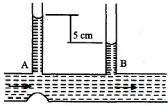 In the diagram shown, the difference in the two tubes of the manometer is $5\, cm$, the cross section of the tube at $A$ and $B$ is $6\, mm^2$ and $10\, mm^2$ respectively. The rate at which water flows through the tube is ........ $ cc/s$ $(g\, = 10\, ms^{-2})$